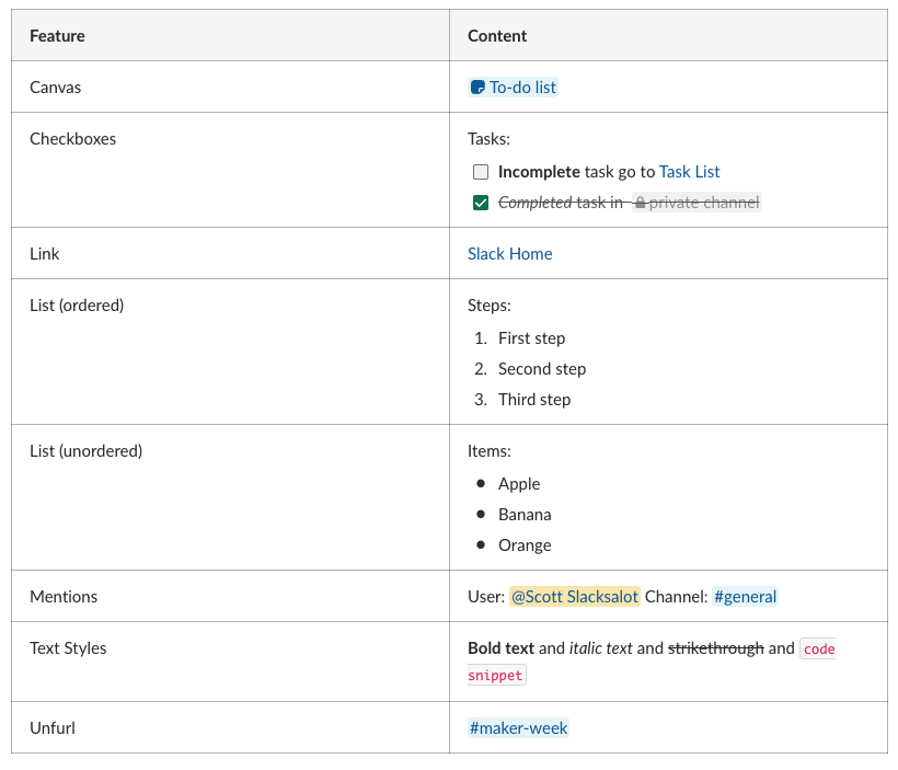 "markdown": "| Feature | Content |\n| ------- | ------- |\n| Canvas |  |\n| Checkboxes | Tasks:<br>- [ ] **Incomplete** task go to [Task List](http://www.your-special-url.com)<br>- [x] *Completed* task in  |\n| Link | [Slack Home](http://docs.slack.dev) |\n| List (ordered) | Steps:<br>1. First step<br>2. Second step<br>3. Third step |\n| List (unordered) | Items:<br>- Apple<br>- Banana<br>- Orange |\n| Mentions | User:  Channel:  |\n| Text Styles | **Bold text** and *italic text* and ~~strikethrough~~ and `code snippet` |\n| Unfurl |  |"